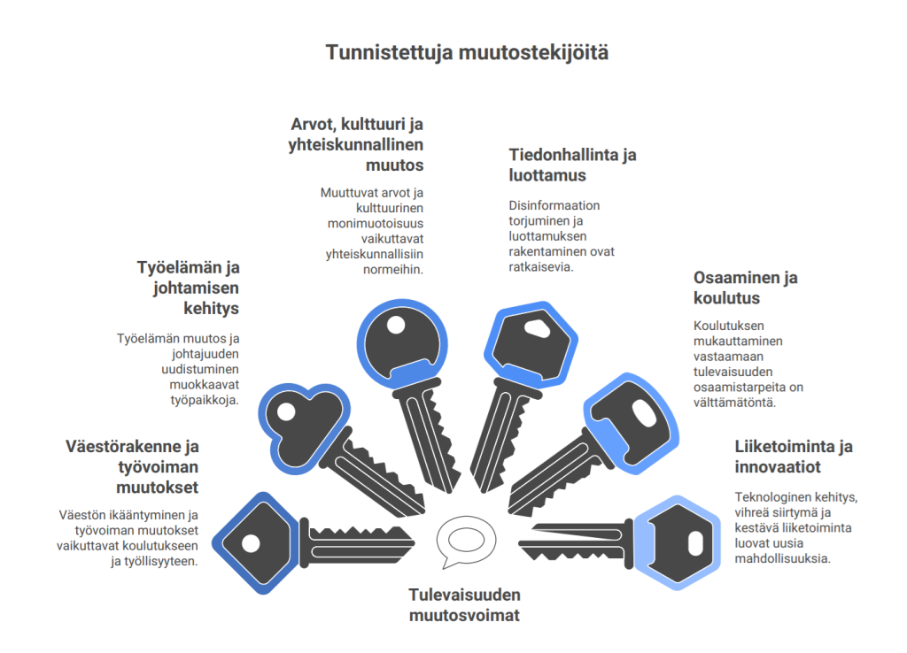 Hämeen osaamistarpeiden ennakointiverkosto kokoontui keväällä 2025 järjestettyyn ennakointityöpajaan tunnistamaan osaamistarpeisiin vaikuttavia muutostekijöitä sekä pohtimaan niiden vaikutuksia alueen tulevaisuuden osaamistarpeisiin. Työskentelyssä hyödynnettiin Sitran megatrendikortteja, Ota trendi haltuun -työkalua sekä Tulevaisuusluotain.fi-sivuston kehitysversion tilastotietoja. Työpajan tuloksena tunnistettiin useita trendejä, joilla arvioitiin olevan merkittävä vaikutus Hämeen tulevaisuuden osaamistarpeisiin.